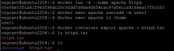 vagrant@ubuntu2204:~$ docker container export apache > httpd.tar