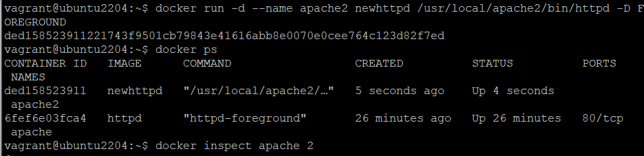 vagrant@ubuntu2204:~$ docker run -d --name apache2 newhttpd /usr/local/apache2/bin/httpd -D FOREGROUND
