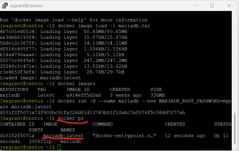 [vagrant@centos ~]$ docker image load -i mariadb.tar