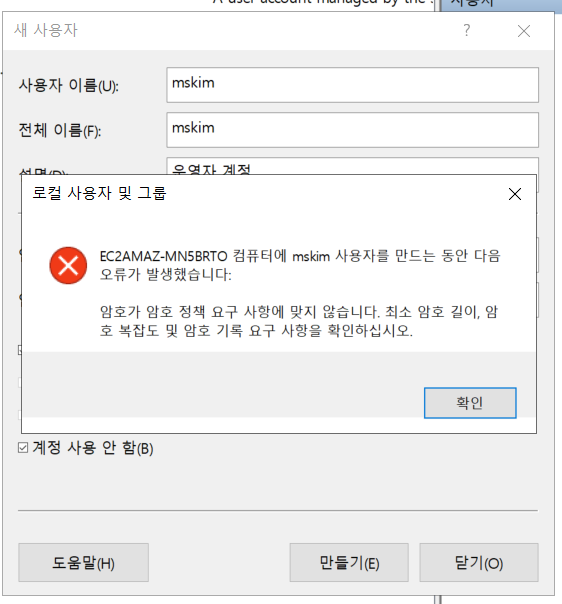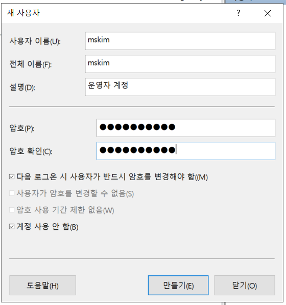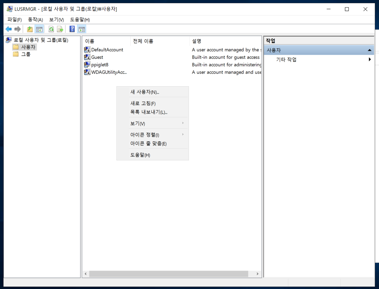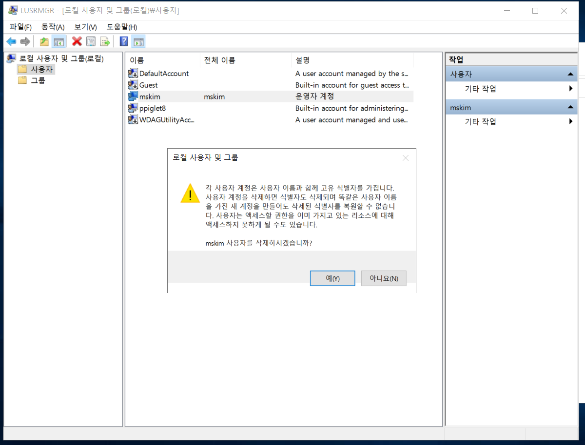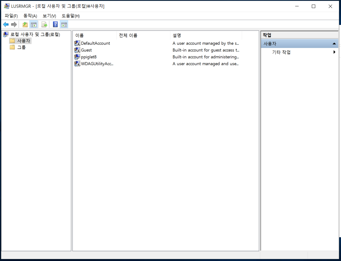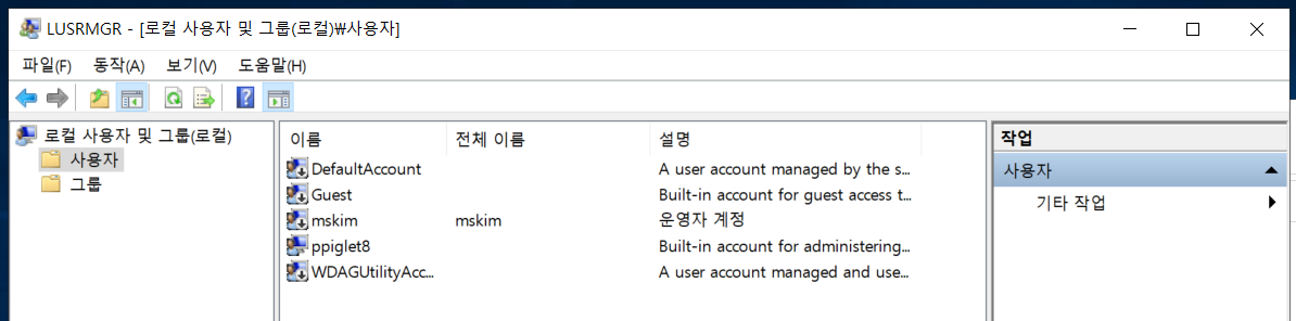 관리자 계정(ppiglet8), 운영자 계정(mskim)이 있고 그외의 DefaultAccount, WDAGUtilityAccount, Guest의 경우 모두 비활성화 되어 있는 계정입니다.
