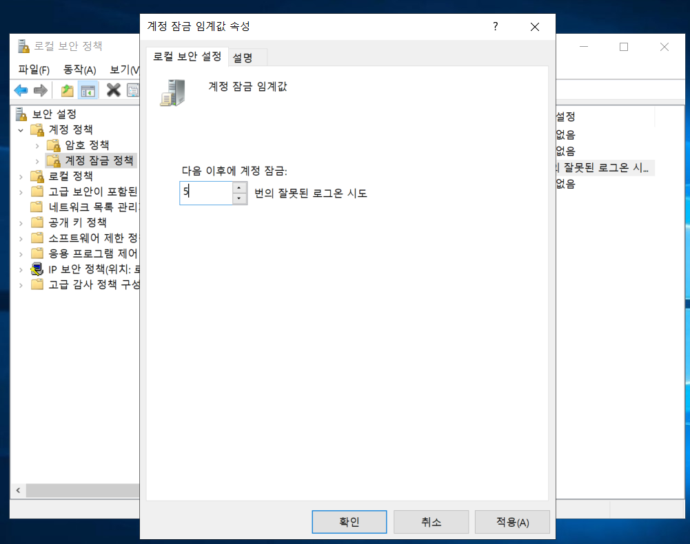 계정 잠금 임계값 설정을 5번으로 변경 완료하였습니다.