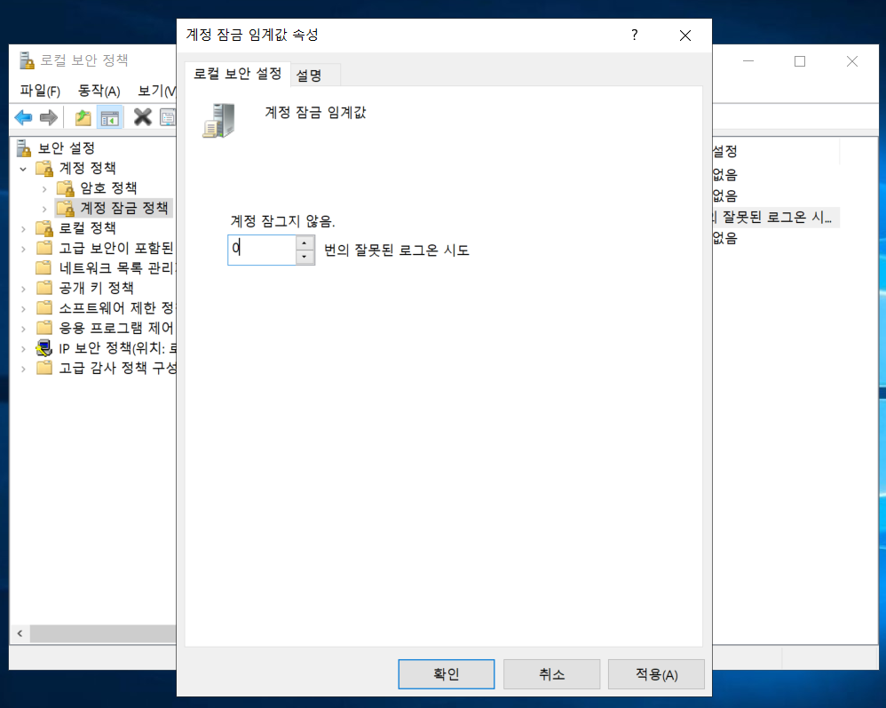 현재는 "0" 번의 잘못된 로그온시도 라고 되어있습니다.