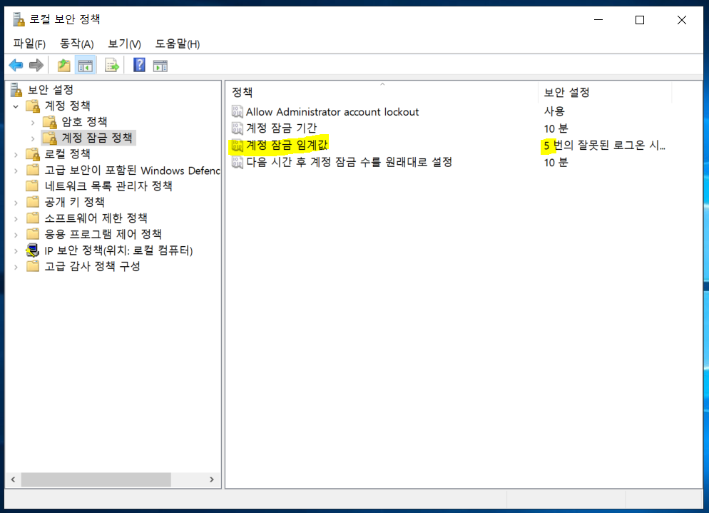 ▶ 조치방법 : 계정 잠금 임계값을 5번 이하의 값으로 설정