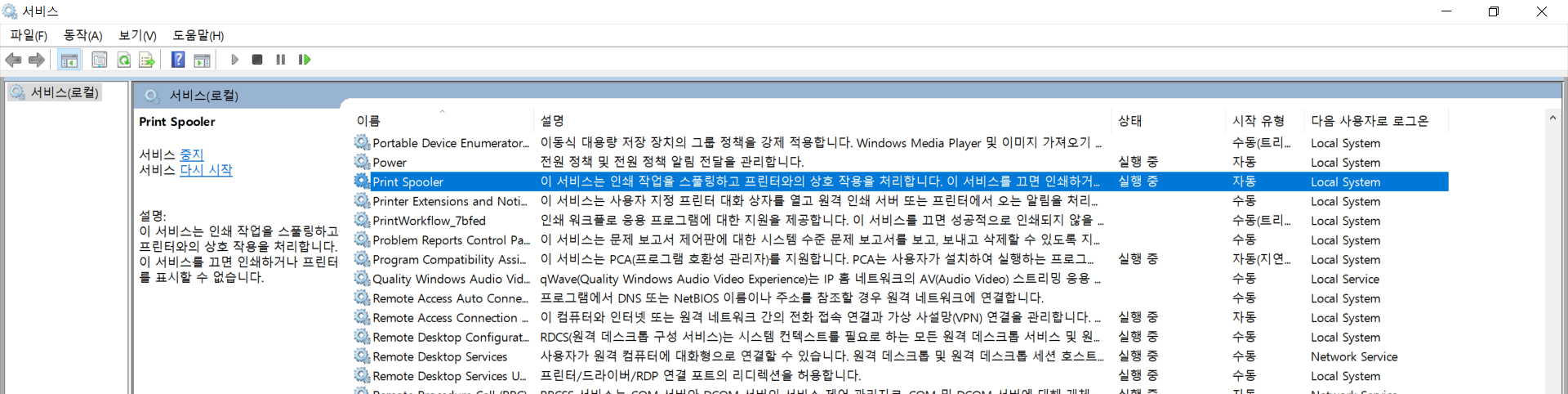 1) Print Spooler 를 더블 클릭 합니다.