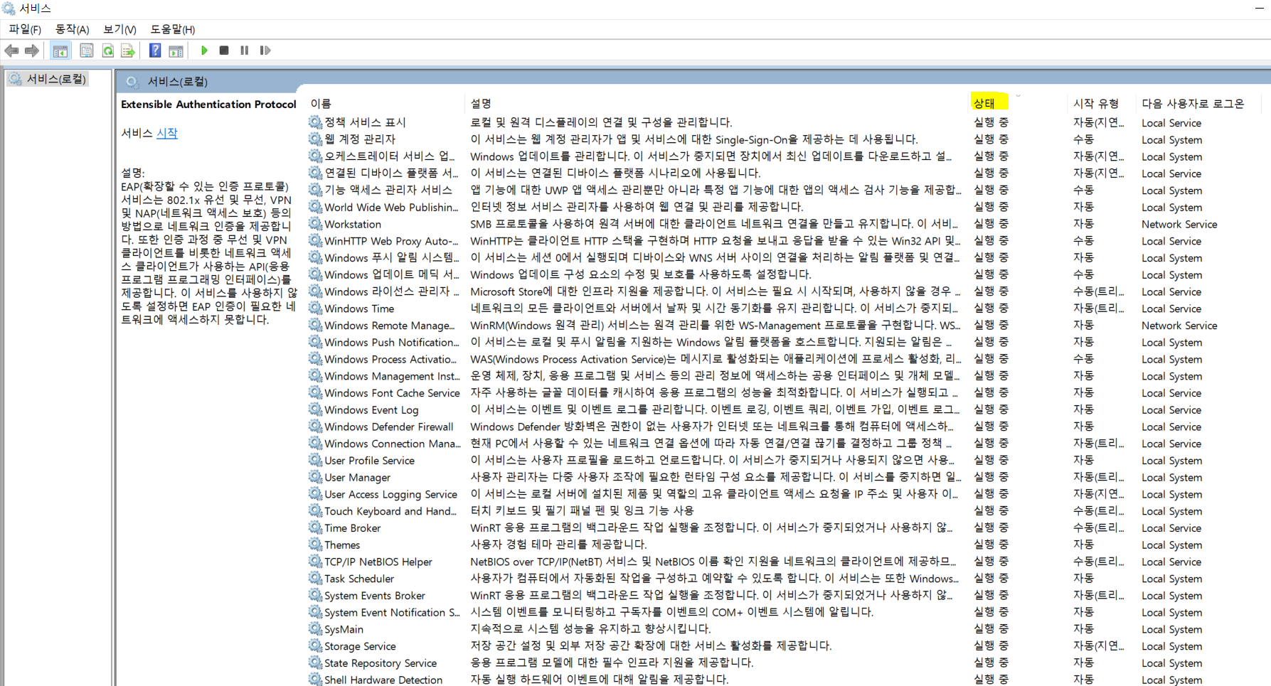 가이드에는 해당서비스를 선택하여 속성을 누르라고 되어있는데... 해당서비스가 무엇인지 확인해보겠습니다.