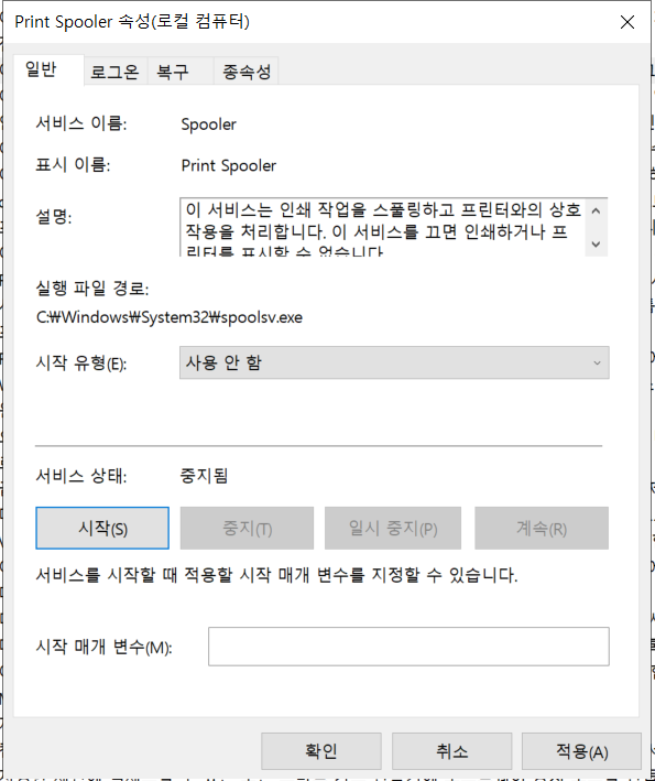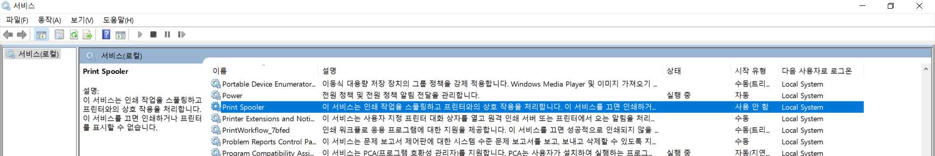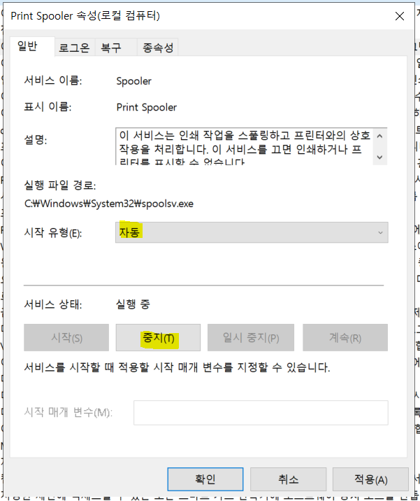 Print Spooler 를 중지 조치해보겠습니다.