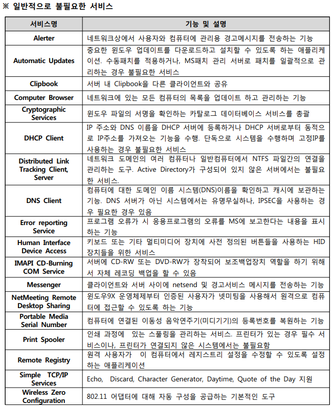 ※ OS 버전에 따라 ‘일반적으로 불필요한 서비스’ 목록에 나열된 서비스가 제공되지 않을 수 있음
