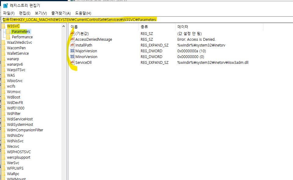 1) 시작> 실행> REGEDIT> HKLM\SYSTEM\CurrentControlSet\Services\W3SVC \Parameters 검색