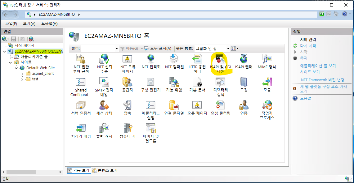 1) 인터넷 정보 서비스(IIS) 관리자> 서버 선택> IIS> "ISAPI 및 CGI 제한" 선택