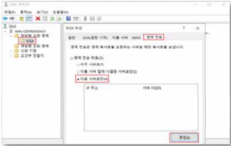 1) 시작> 실행> DNSMGMT.MSC> 각 조회 영역> 해당 영역> 속성> 영역 전송 > “다음 서버로만” 선택 후 전송할 서버 IP 추가