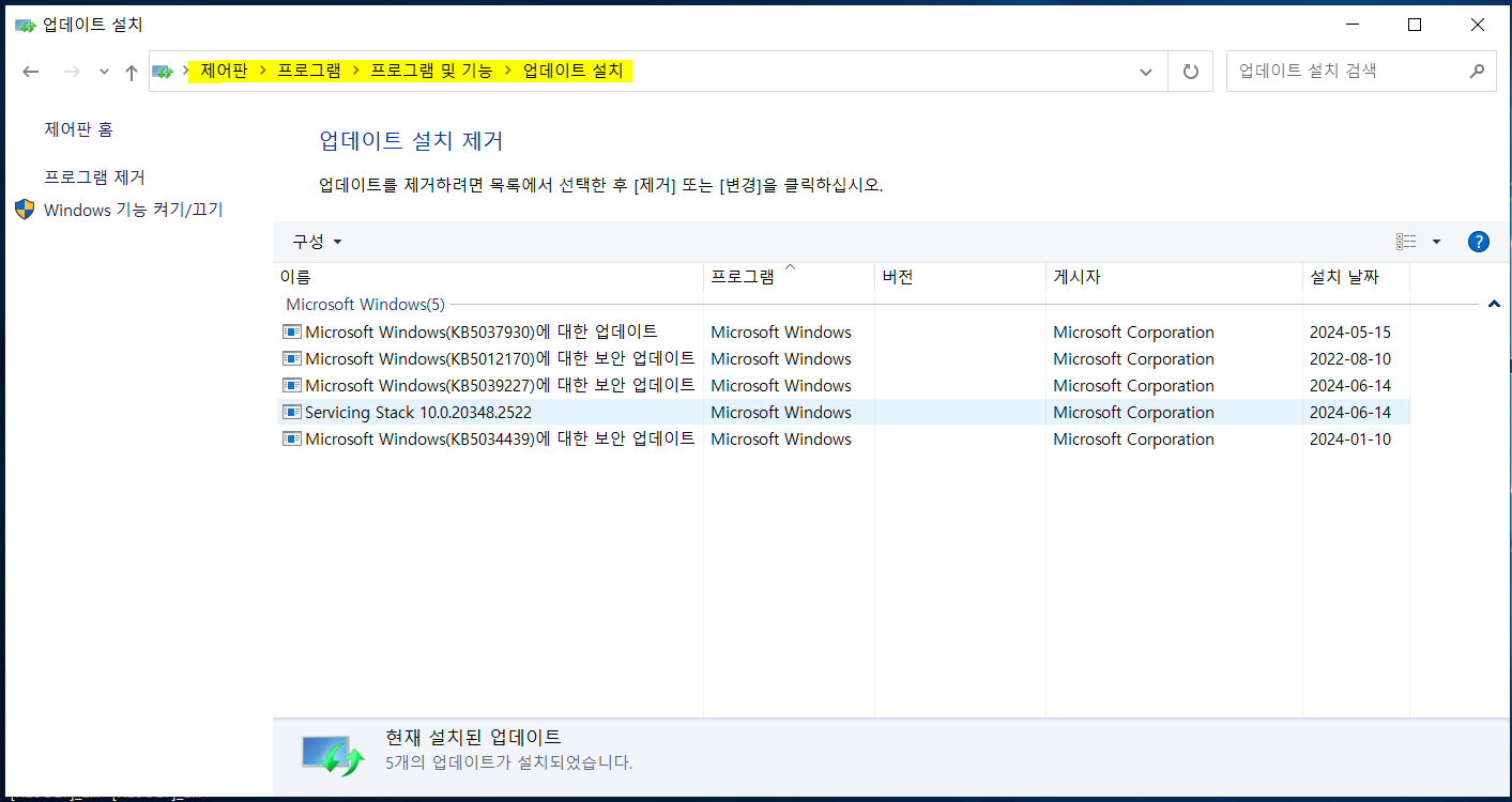 제어판 > 프로그램 > 프로그램 및 기능 > 업데이트 설치
