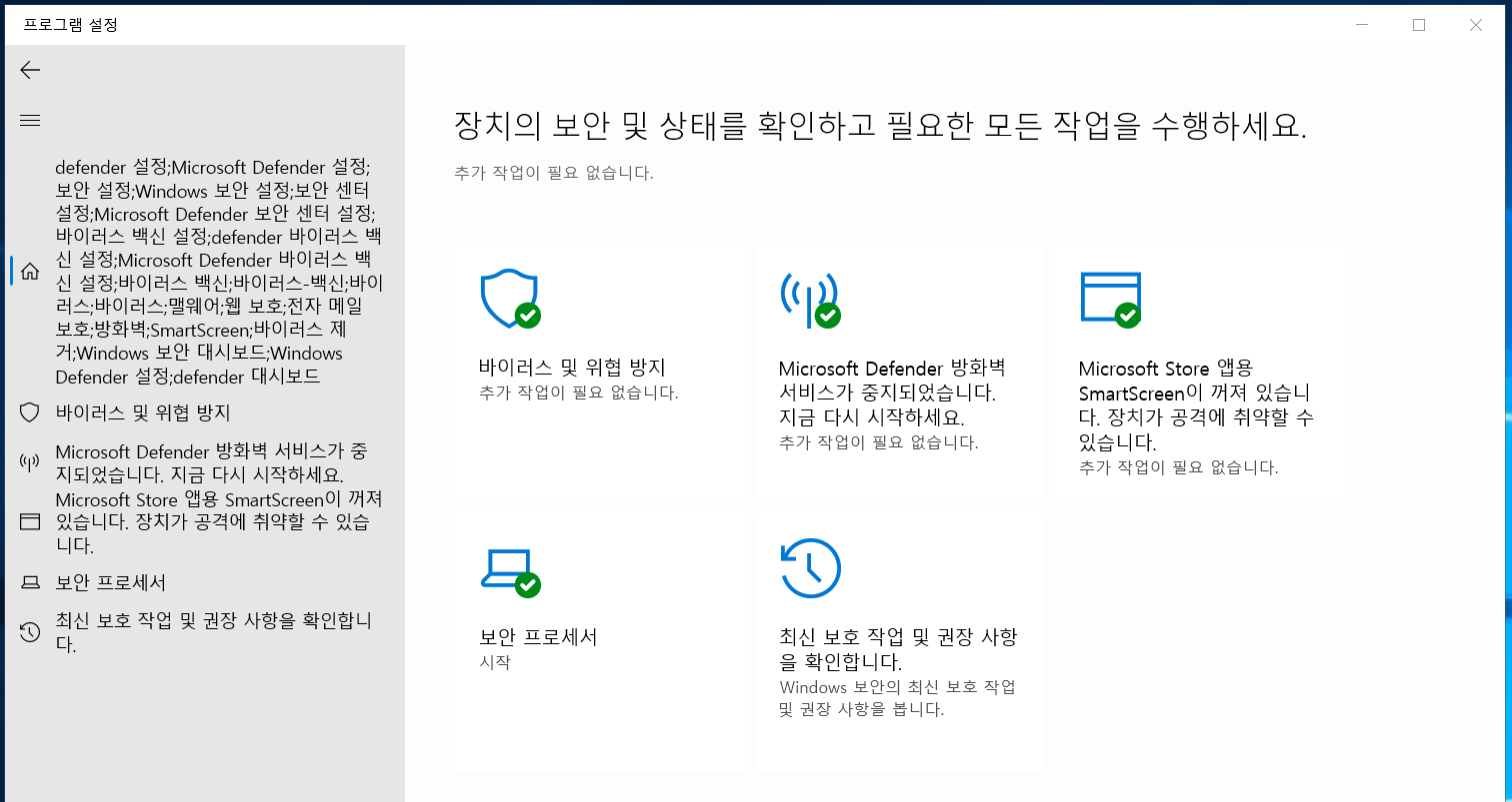 그 외에 백신이 없을 경우, 윈도우에서 제공하는 백신이 있습니다. PC에도 있듯이 윈도우서버에도 동일한게 있습니다.
