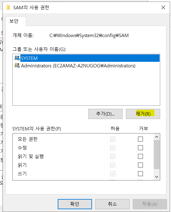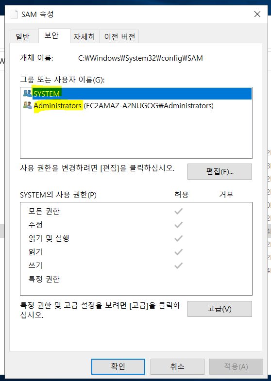 2) Administrator, System 그룹 외 다른 사용자 및 그룹 권한 확인