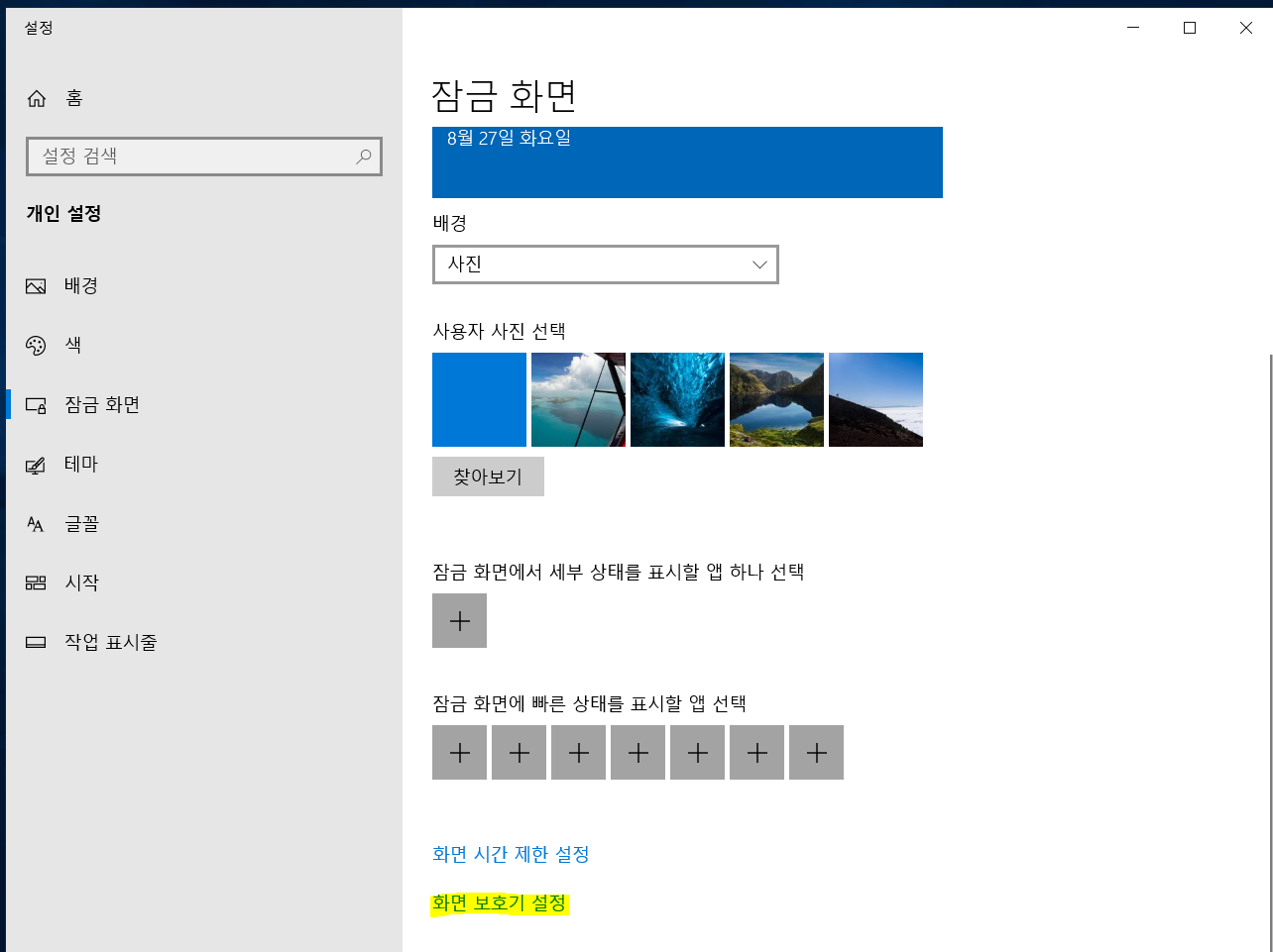 1) 바탕화면> 마우스 우클릭> 개인 설정> 잠금화면 > 화면 보호기 설정