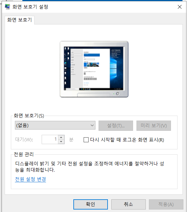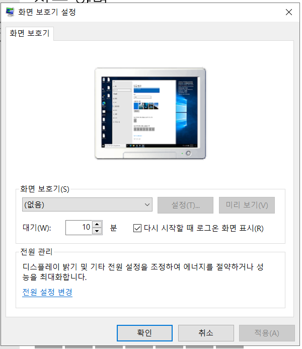 "다시 시작할 때 로그온 화면 표시" 체크, "대기 시간" 10분 설정 합니다.