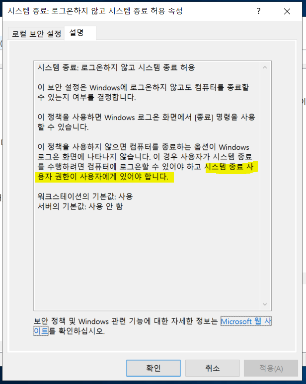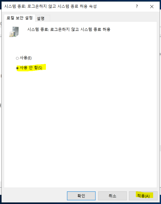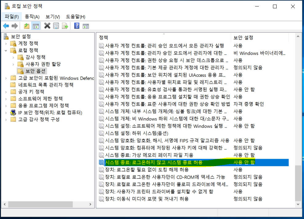 2) “시스템 종료: 로그온 하지 않고 시스템 종료 허용”을 “사용 안 함“으로 설정되어있는지 여부 확인
