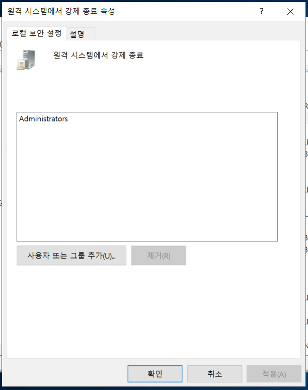 · 양호 : “원격 시스템에서 강제로 시스템 종료” 정책에 “Administrators”만 존재하는 경우
