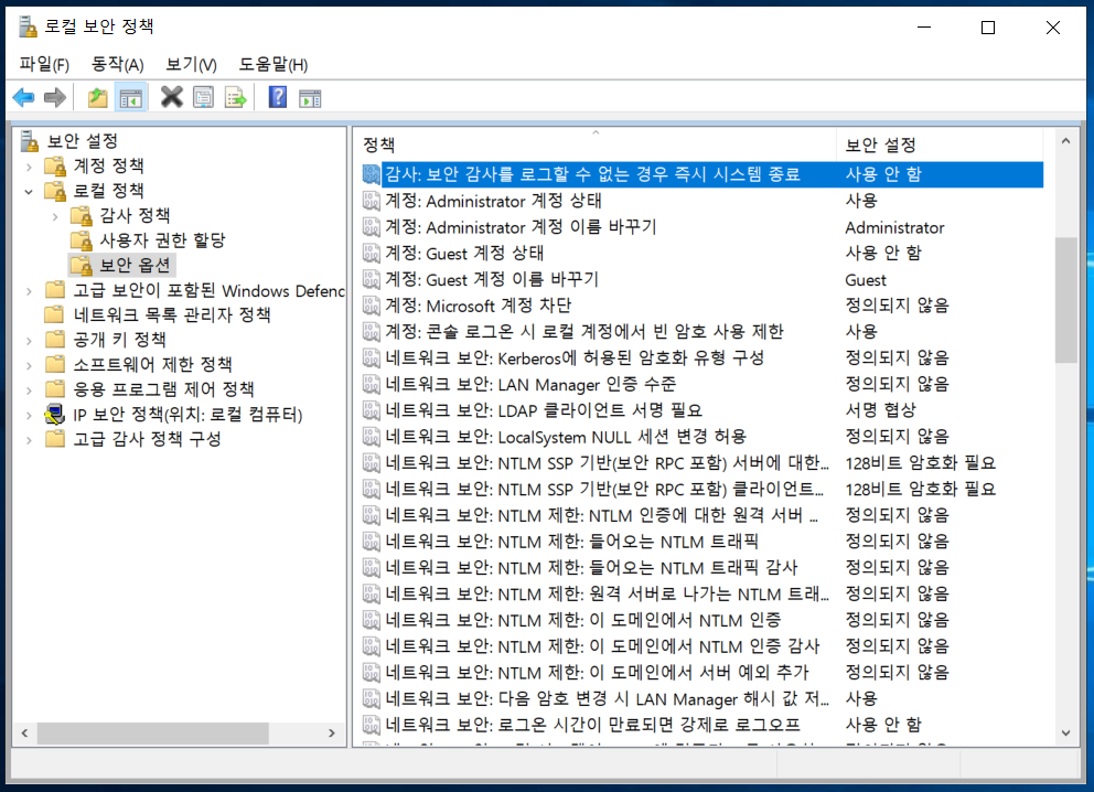 ▶ 조치방법 : 보안 감사를 로그할 수 없는 경우 즉시 시스템 종료 -> 사용 안 함