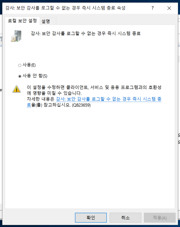 2) “감사: 보안 감사를 로그할 수 없는 경우 즉시 시스템 종료” 정책을 “사용 안 함” 으로 설정