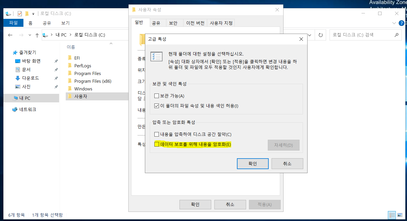 1) 폴더 선택> 속성> [일반] 탭> 고급> 고급 특성> “데이터 보호를 위해 내용을 암호화” 선택여부 확인합니다.