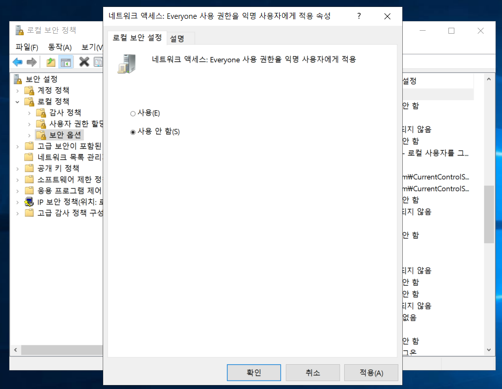 초기값으로 "Everyone 사용 권한을 익명 사용자에게 적용" 정책이 "사용 안 함"으로 설정되어있음을 확인 할 수 있습니다.