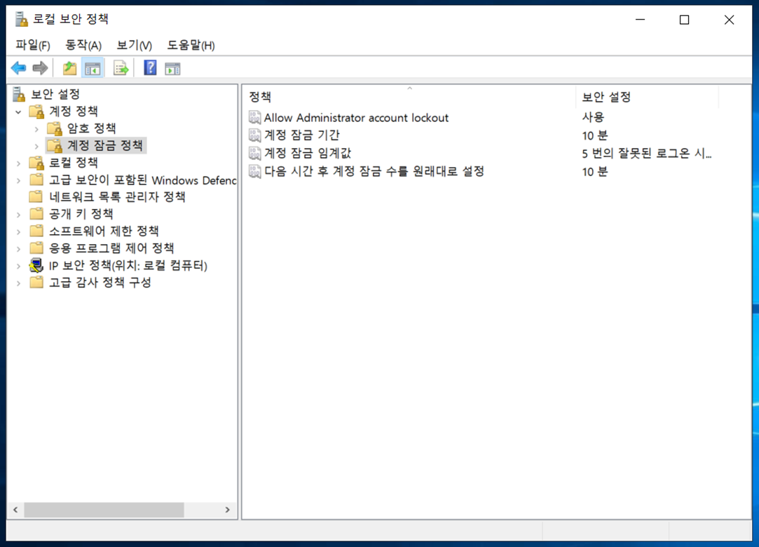 "계정 잠금 기간", "다음 시간 후 계정 잠금 수를 원래대로 설정"이 10분으로 설정되어있음을 확인 할 수 있습니다.