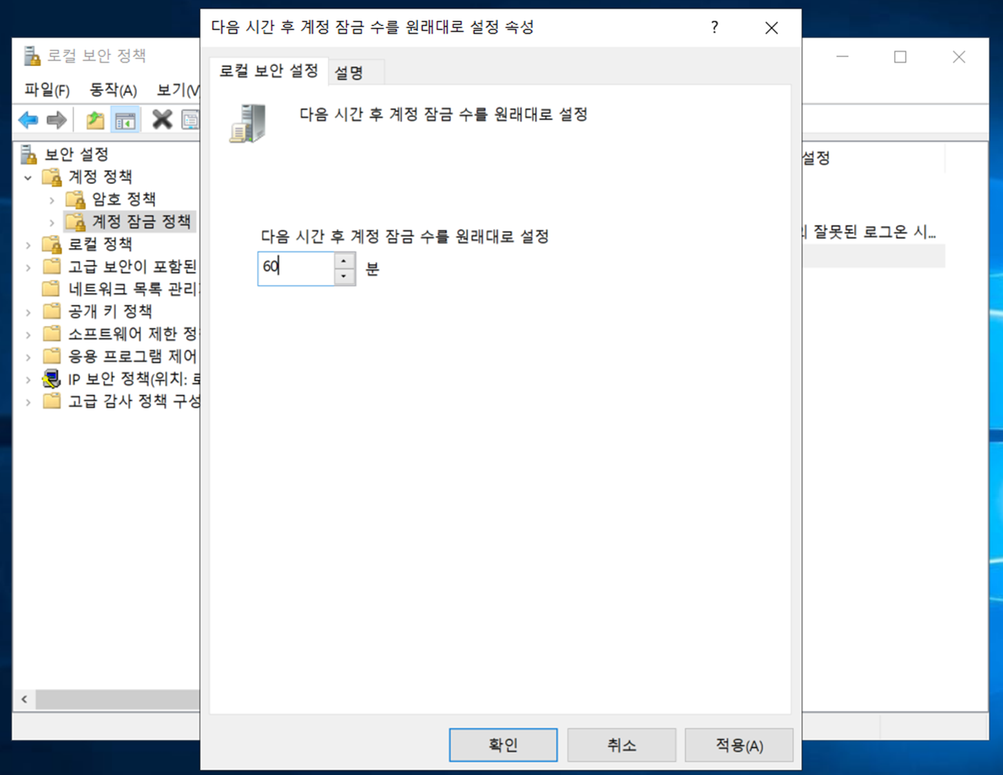 2) 다음 시간 후 계정 잠금 수를 원래대로 설정 을 60분으로 변경해줍니다.