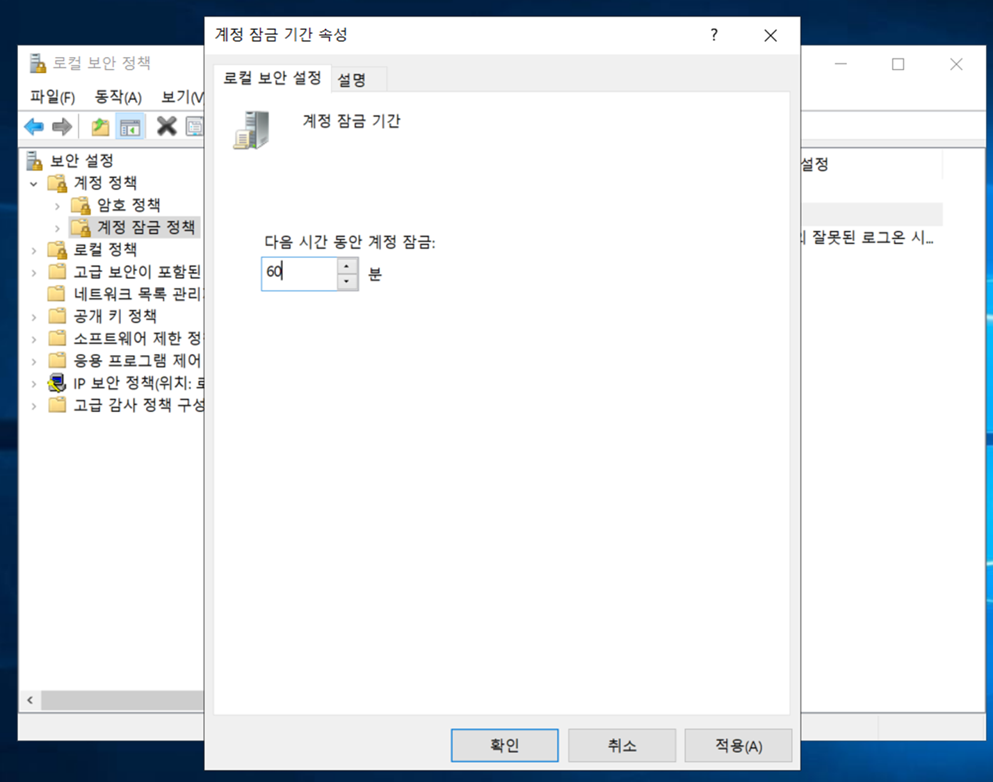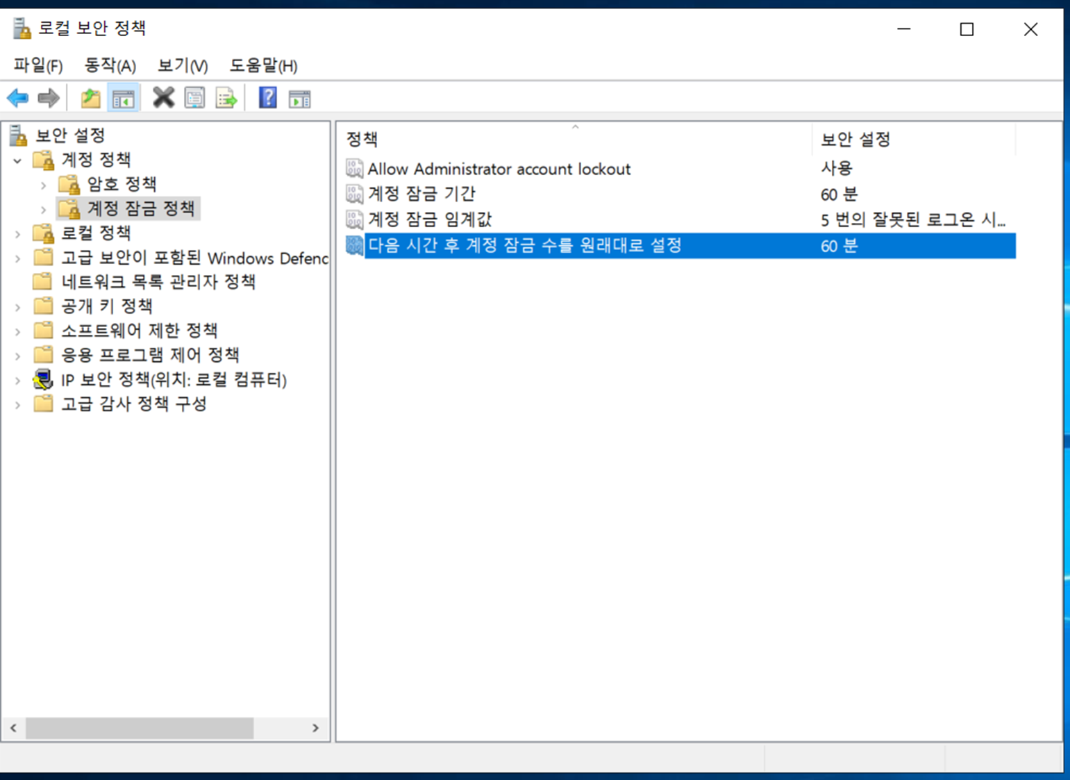 "계정 잠금 기간" 및 "잠금 기간 원래대로 설정 기간" 설정을 60분으로 완료하였습니다.