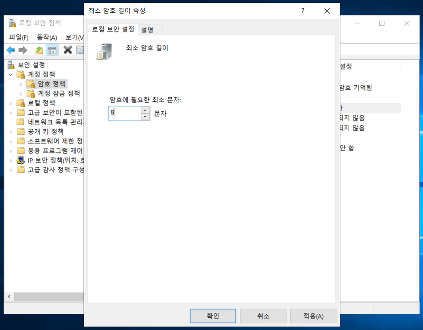 1) "최소 암호 길이"를 더블클릭하여 최소 암호 길이를 8이상으로 변경해주시면 됩니다.