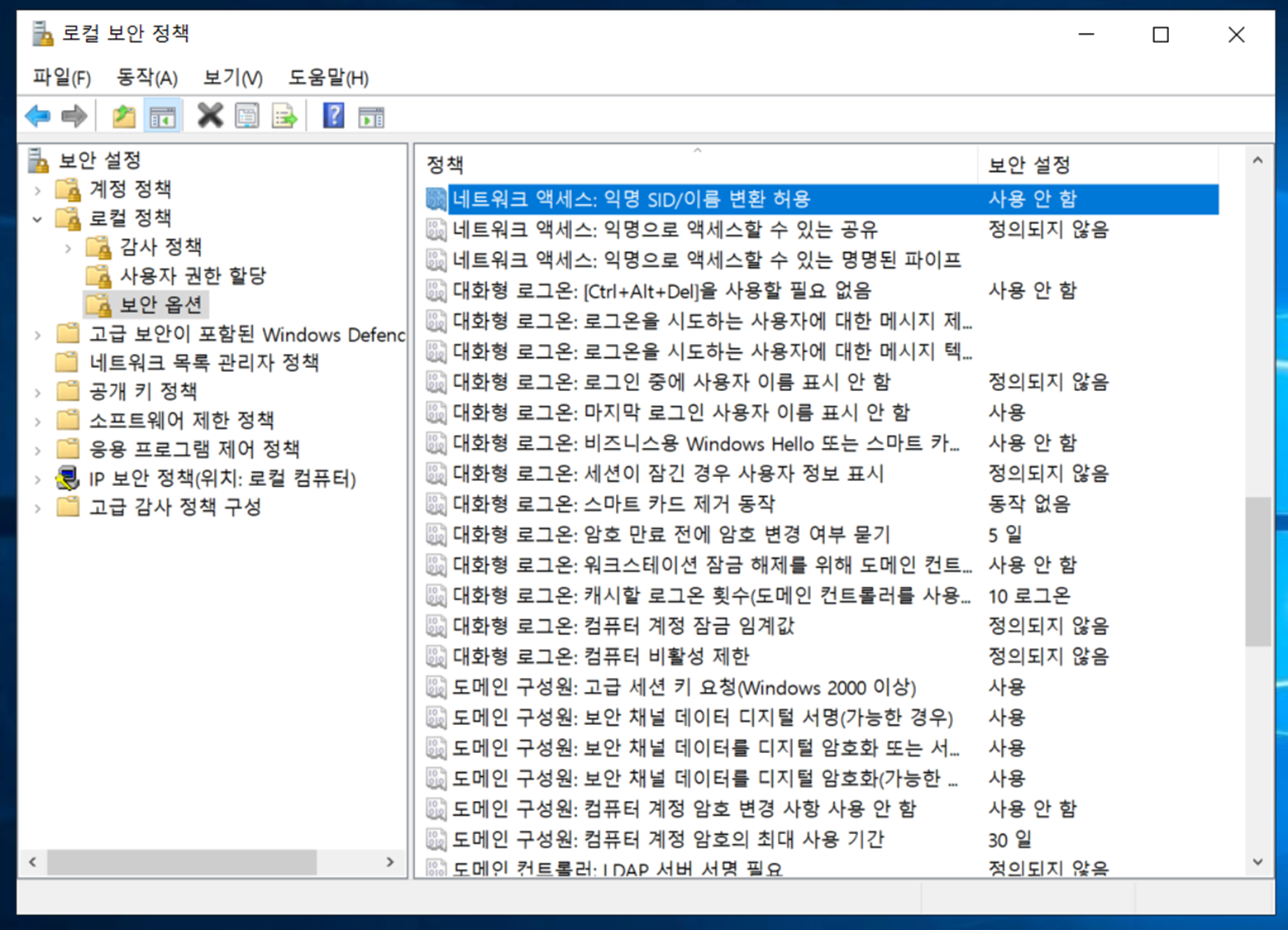 "네트워크 액세스: 익명 SID/이름 변환 허용" 정책이 "사용 안 함"으로 설정되어있습니다.