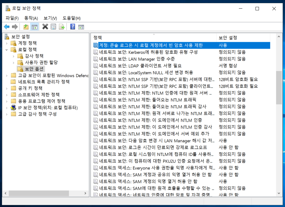 “콘솔 로그온 시 로컬 계정에서 빈 암호 사용 제한” 정책이 “사용” 되어있음을 확인 할 수 있습니다.