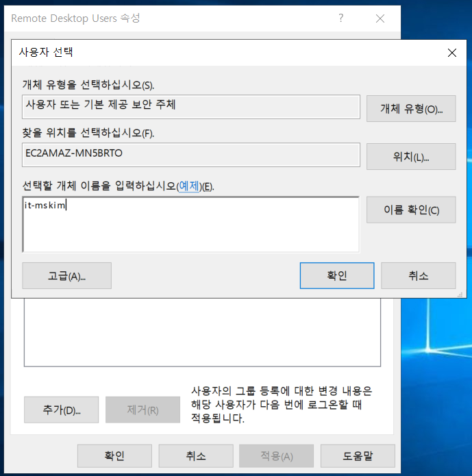 Remote Desktop Users 그룹에 원격접속이 가능한 계정을 추가합니다.