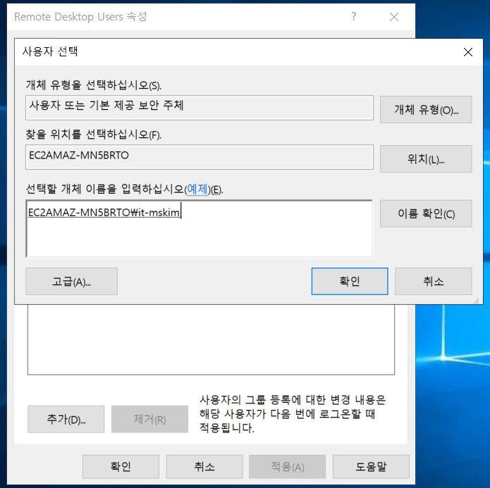 Remote Desktop Users 그룹에 원격접속이 가능한 계정을 추가합니다.