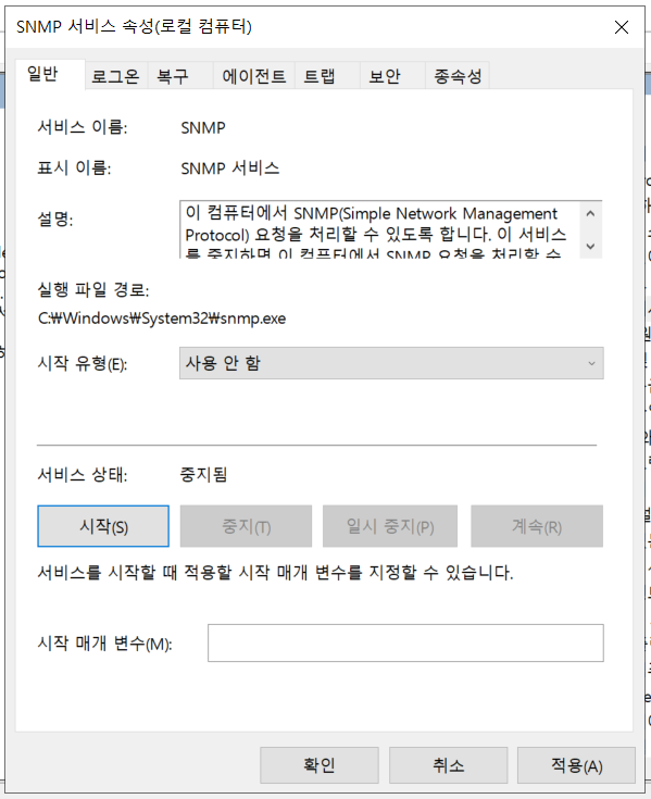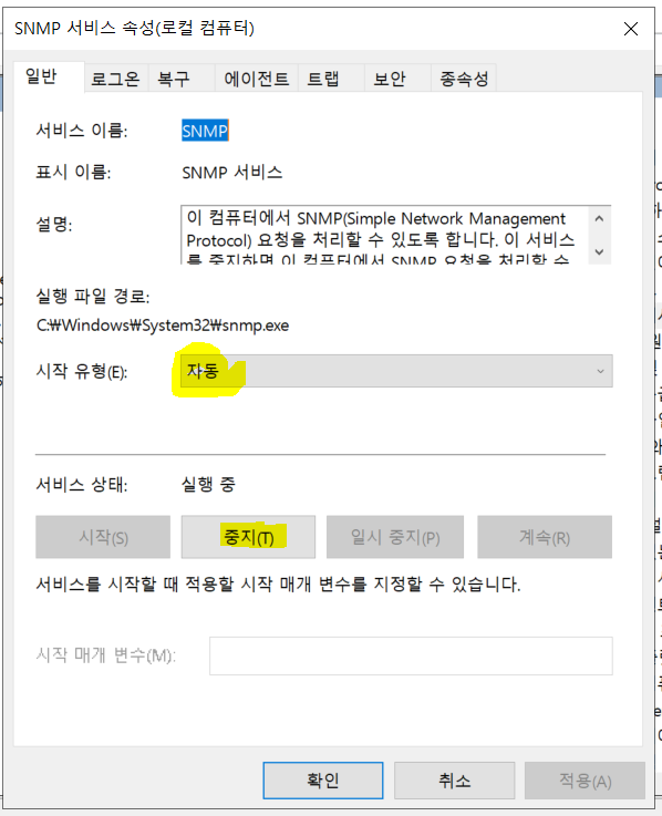 1) 시작> 실행> SERVICES.MSC> SNMP Service(또는, SNMP 서비스)> 속성에서 “시작 유형”을 “사용 안 함”으로 설정한 후, SNMP 서비스를 중지