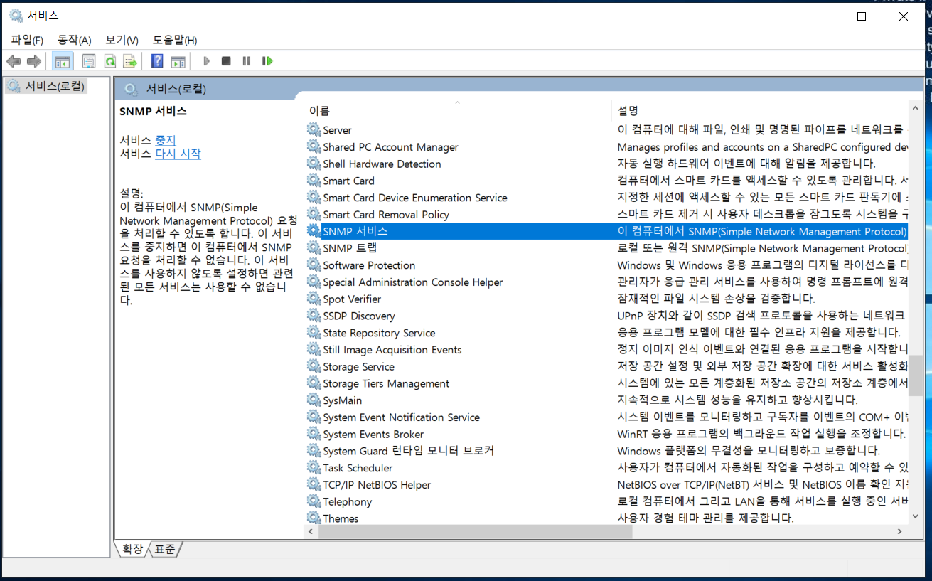 1) 시작> 실행> SERVICES.MSC> SNMP Service(또는, SNMP 서비스) 가 있는지 확인합니다.