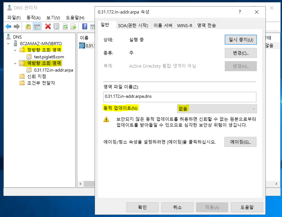 **참고 : 일단 기본적으로 dns를 생성하면 동적업데이트 없음으로 우선 설정되어있습니다.