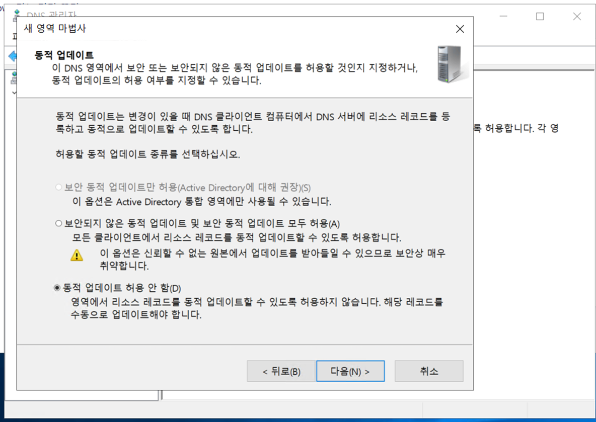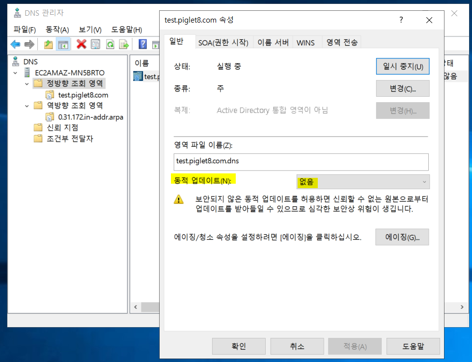 **참고 : 일단 기본적으로 dns를 생성하면 동적업데이트 없음으로 우선 설정되어있습니다.