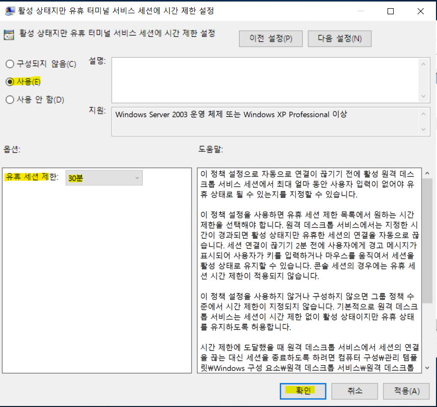 3) [활성 상태지만 유휴 터미널 서비스 세션에 시간 제한 설정]> [유휴 세션 제한]을 30분으로 설정