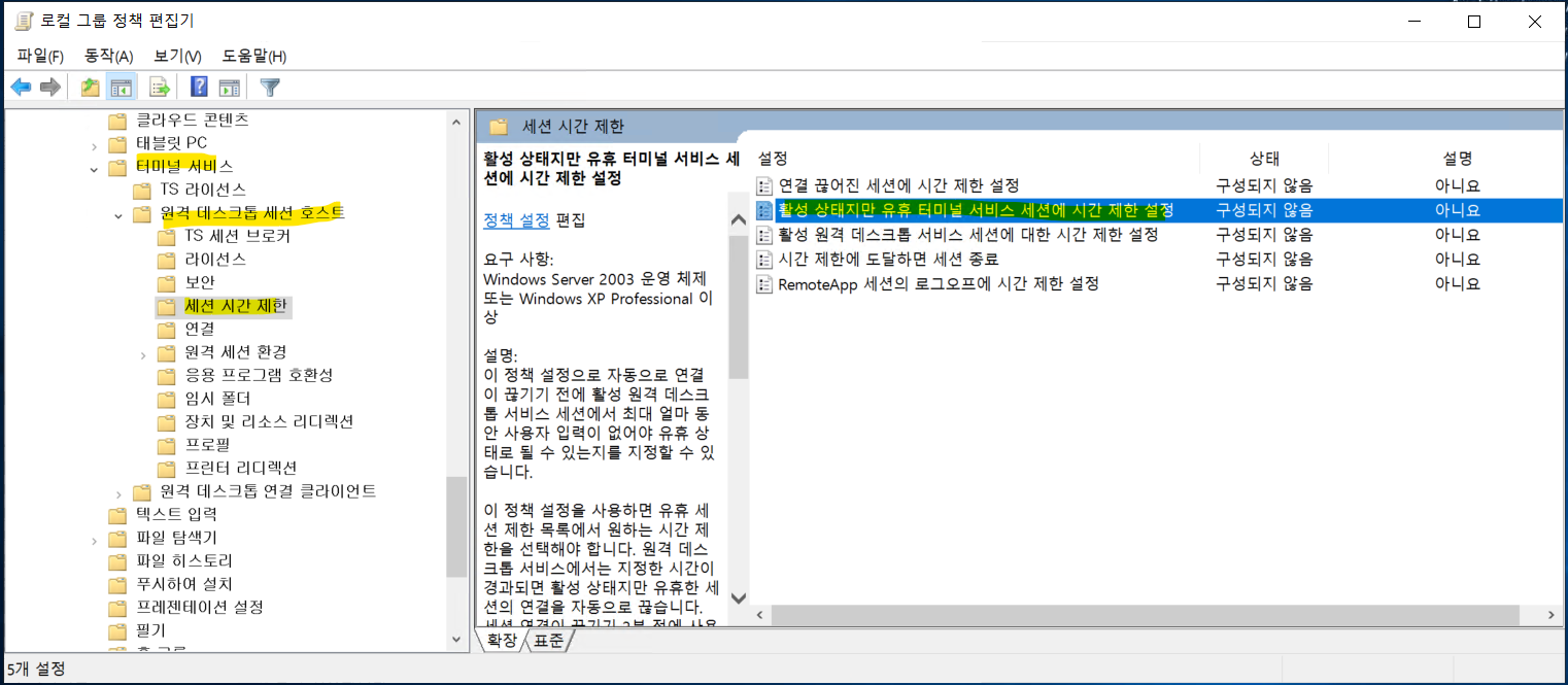2) 컴퓨터 구성> 관리 템플릿> Windows 구성 요소> 터미널 서비스> 원격 데스크톱 세션 호스트> 세션 시간 제한>