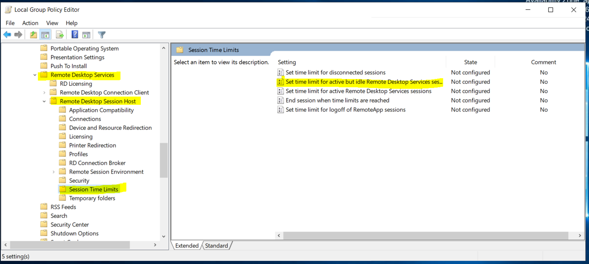 HKEY_LOCAL_MACHINE\SYSTEM\CurrentControlSet\Control\Terminal Server\WinStations\RDP-Tcp > MaxIdleTime