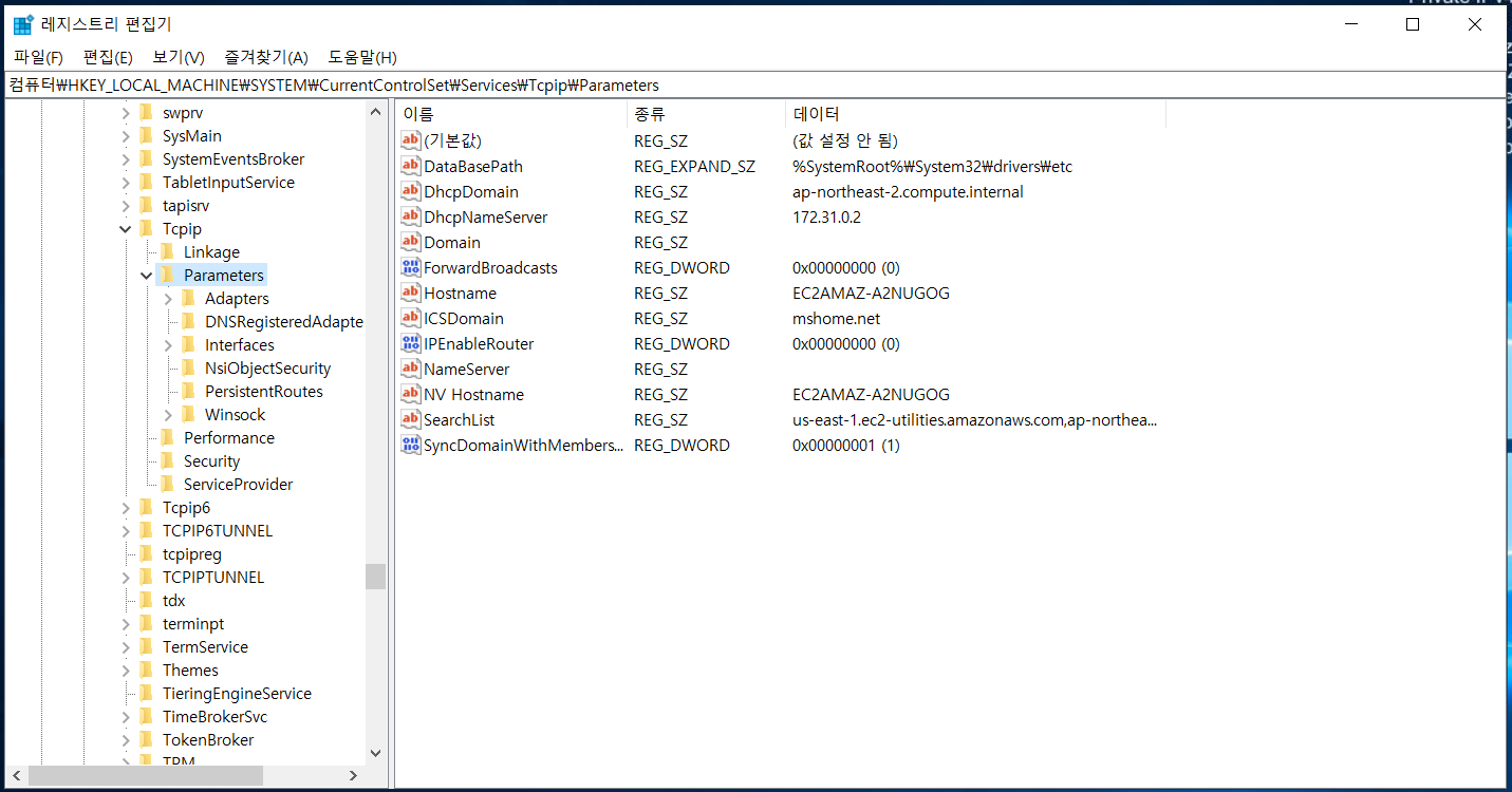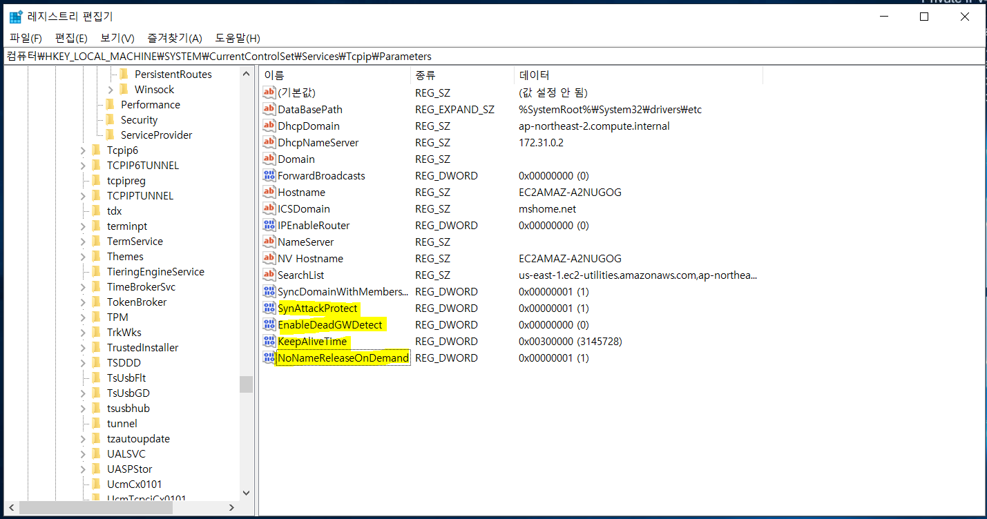 SynAttackProtect, EnableDeadGWDetect, KeepAliveTime, NoNameReleaseOnDemand 항목이 없습니다.