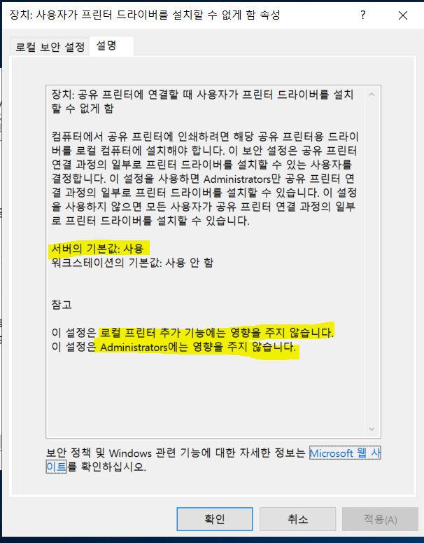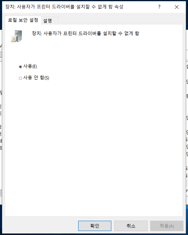 2) “장치: 사용자가 프린터 드라이버를 설치할 수 없게 함” 정책을 “사용” 으로 되어있는지 확인