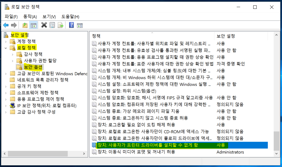 ▶ 조치방법 : 사용자가 프린터 드라이버를 설치할 수 없게 함 → 사용