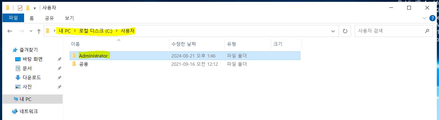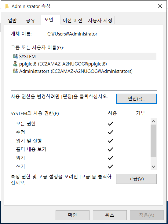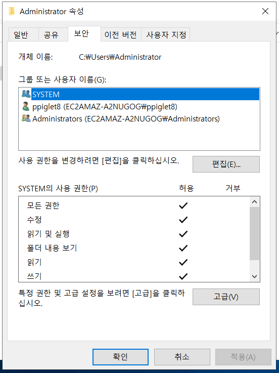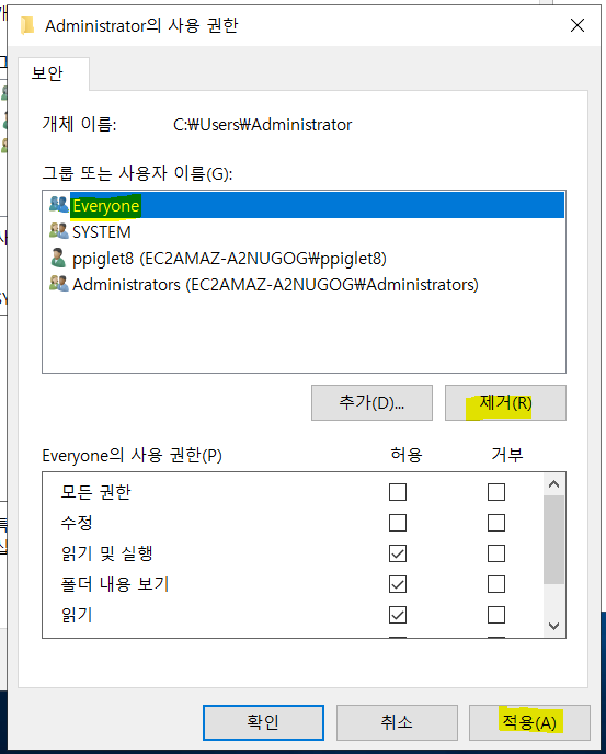 C 드라이브의 사용자에 공용계정도 있는데 여기는 everyone이 있어도 상관없습니다!