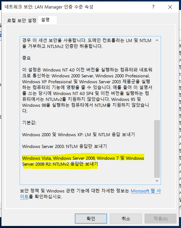 2008 이하 버전까지는 조치 하지 않아도 기본값이 "NTLMv2 응답만 보내기” 입니다.