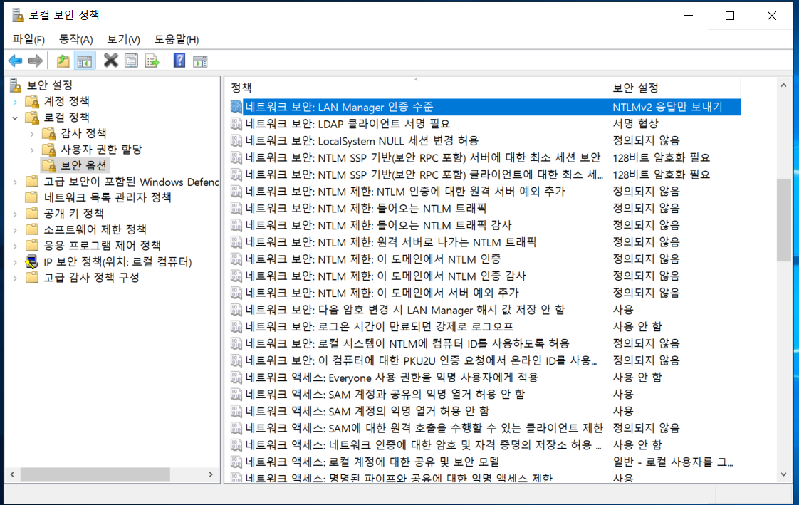 2) “네트워크 보안: "LAN Manager 인증 수준” 정책에 "NTLMv2 응답만 보내기” 설정
