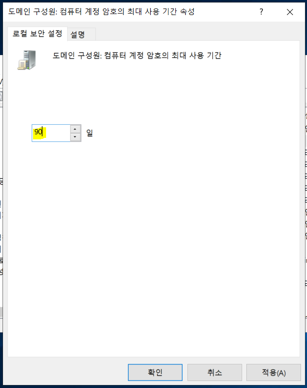 도메인 구성원: 컴퓨터 계정 암호의 최대 사용 기간 → 90일