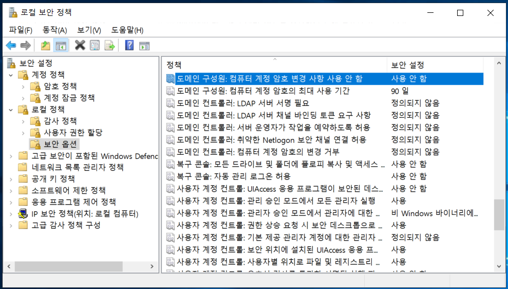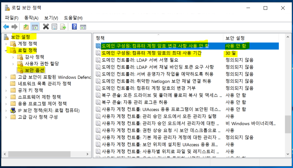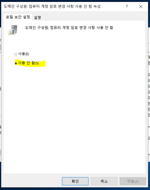 컴퓨터 계정 암호 변경 사용 안 함 → 사용 안 함