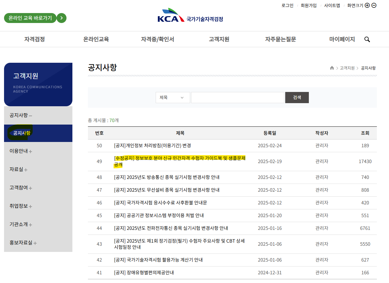 70 [공지] 2025년도 제2회 정기검정 실기시험 수험자 주요 안내사항 2025-06-16 관리자 4352 69 [공지] 항공무선통신사 실기 CBT검정 시행일정 변경 안내 2025-06-13 괸리자 2571 68 [공지] 정보통신기술사 필