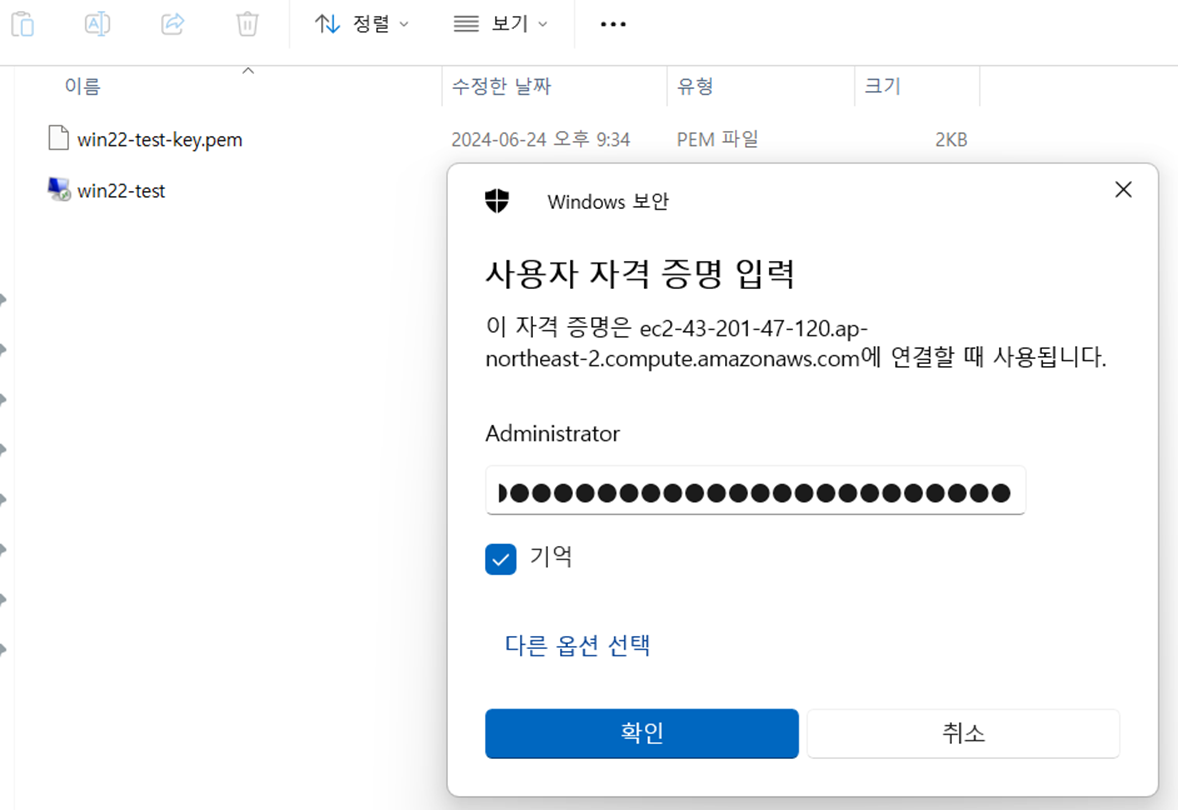 여기 비밀번호는 앞에서 진행했던 원격데스크톱 "암호"를 넣어주면됩니다.